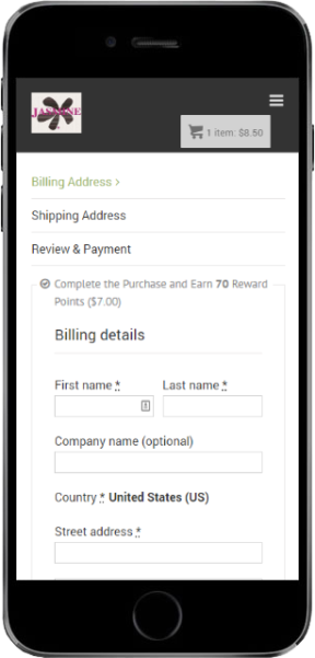 Jasmine Rewards is a loyalty program we designed to thank our wonderful customers (YOU). Customers receive points for every transaction ($1 spent = 1 point) by simply ordering online on our website at jasminetx.com while logged in.